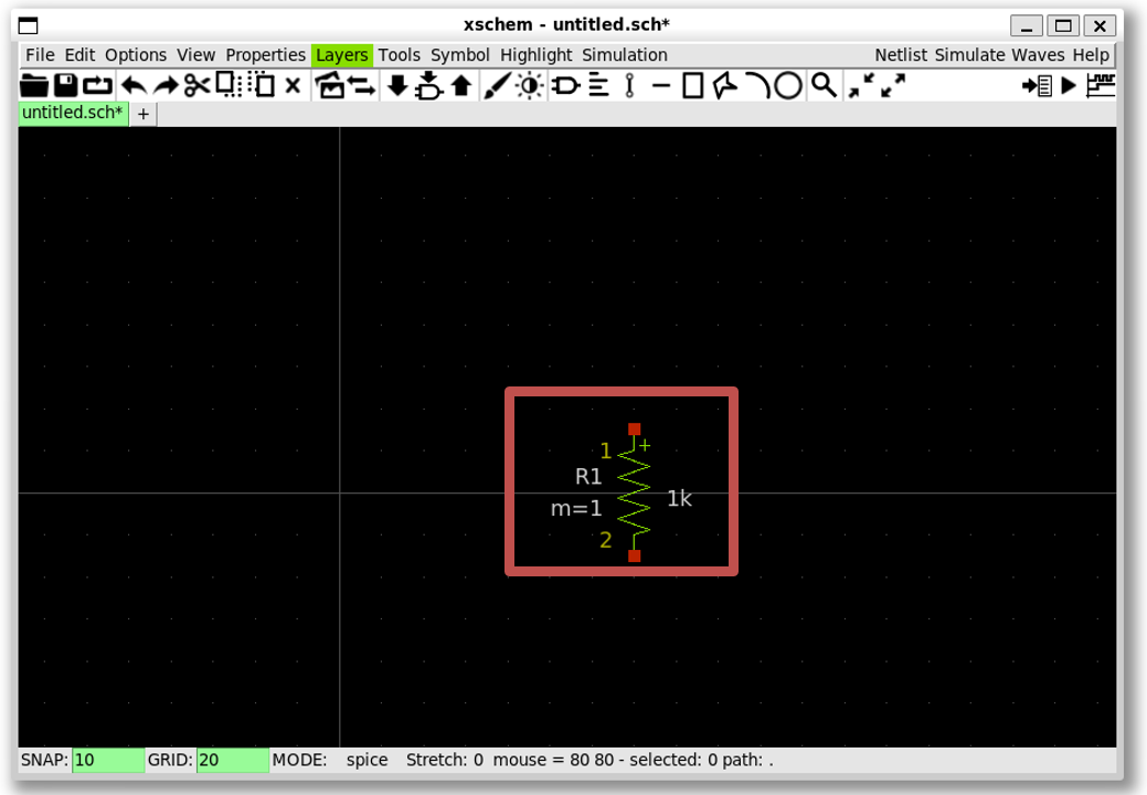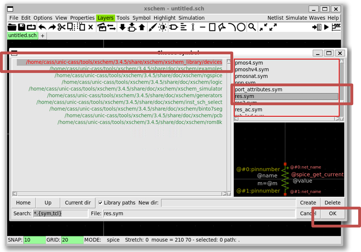 xscheme_library/devices»res.sym»OK» Click on the schematic windows