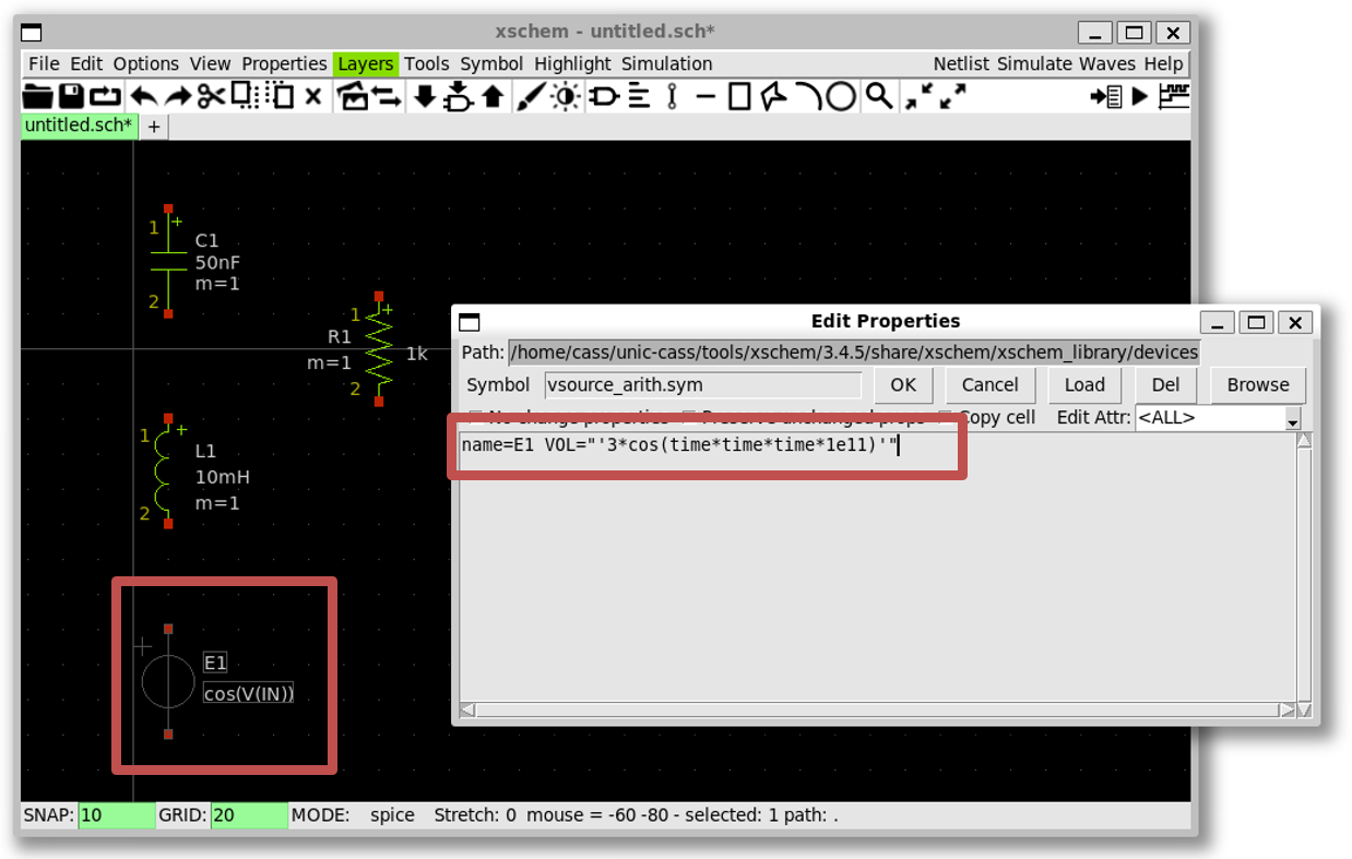 voltage sourceand pressq; change the value ofE1to" '3*cos(time*time*time*1e11)' "then pressOK(note the single and doulbe quotes)