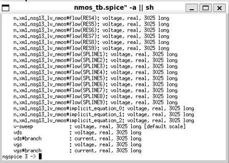 NGSpicesimulation terminal, displaying the nodes in the schematic by enterringdisplaycommand