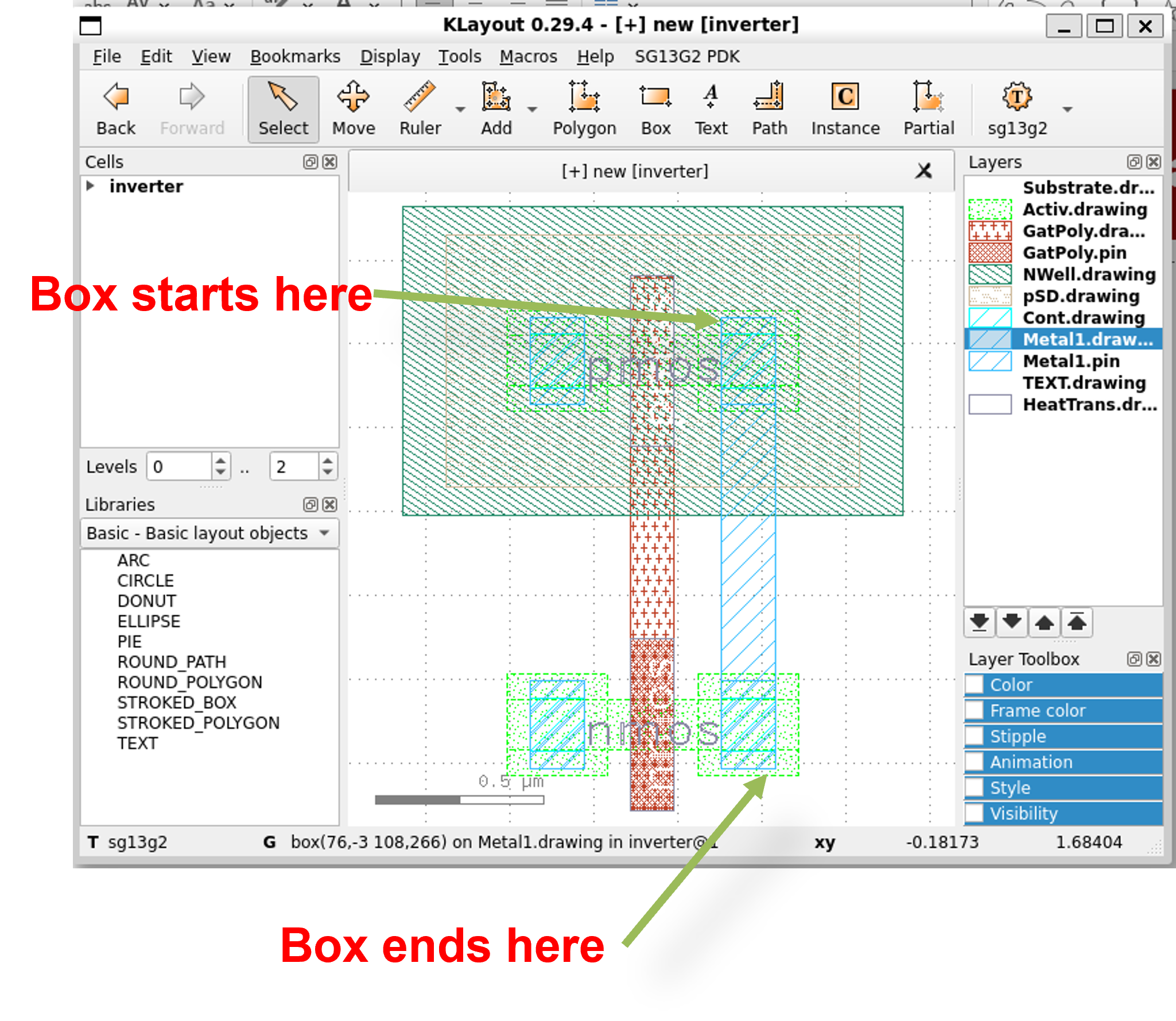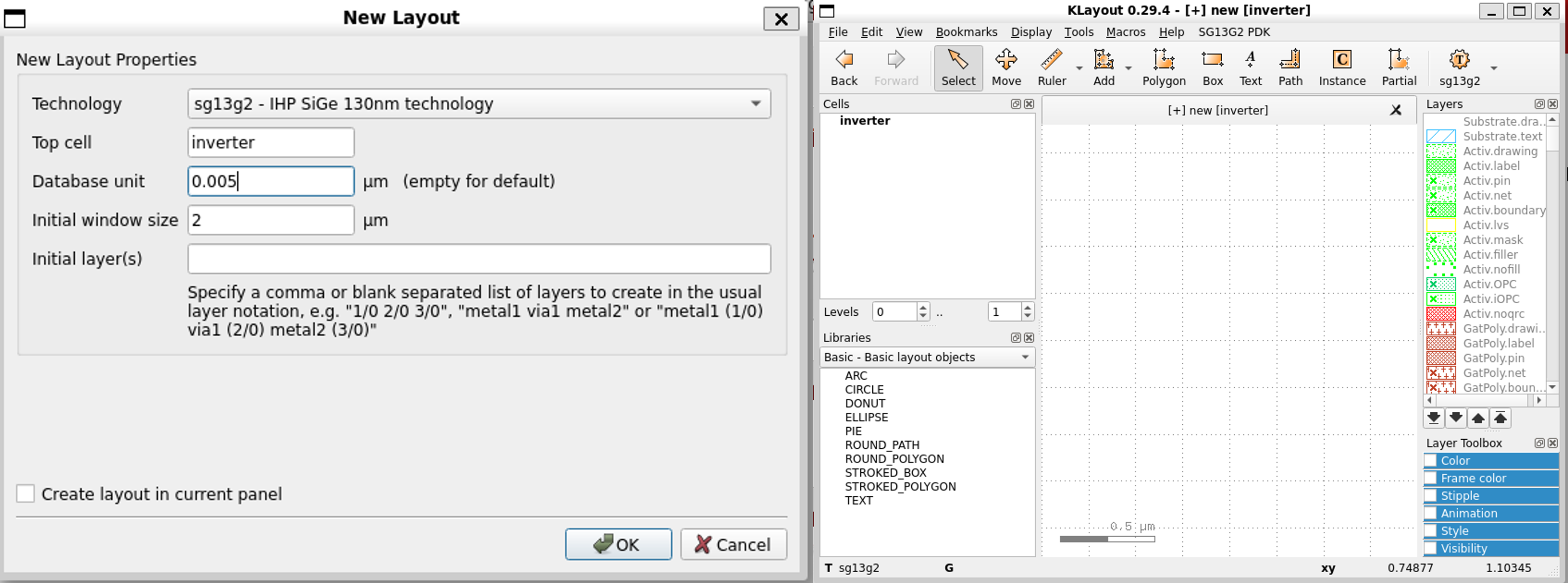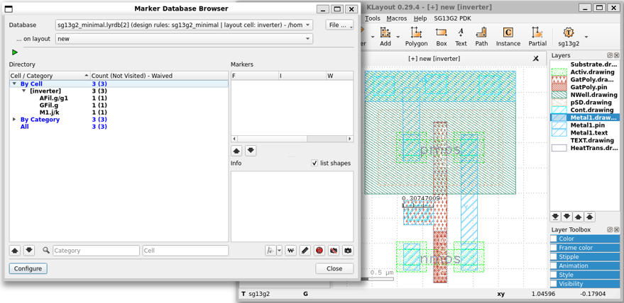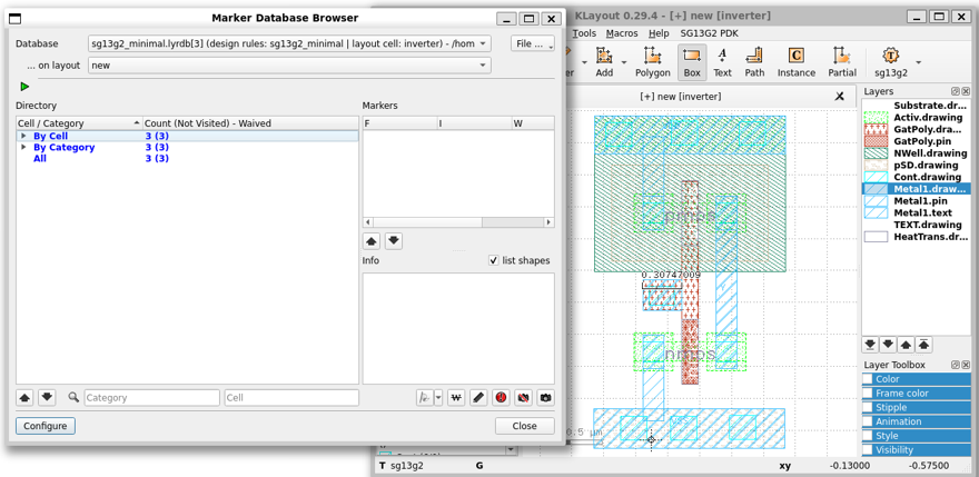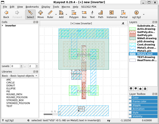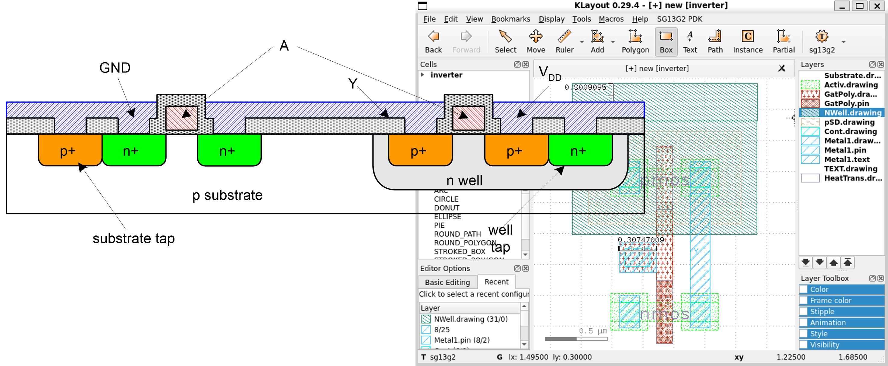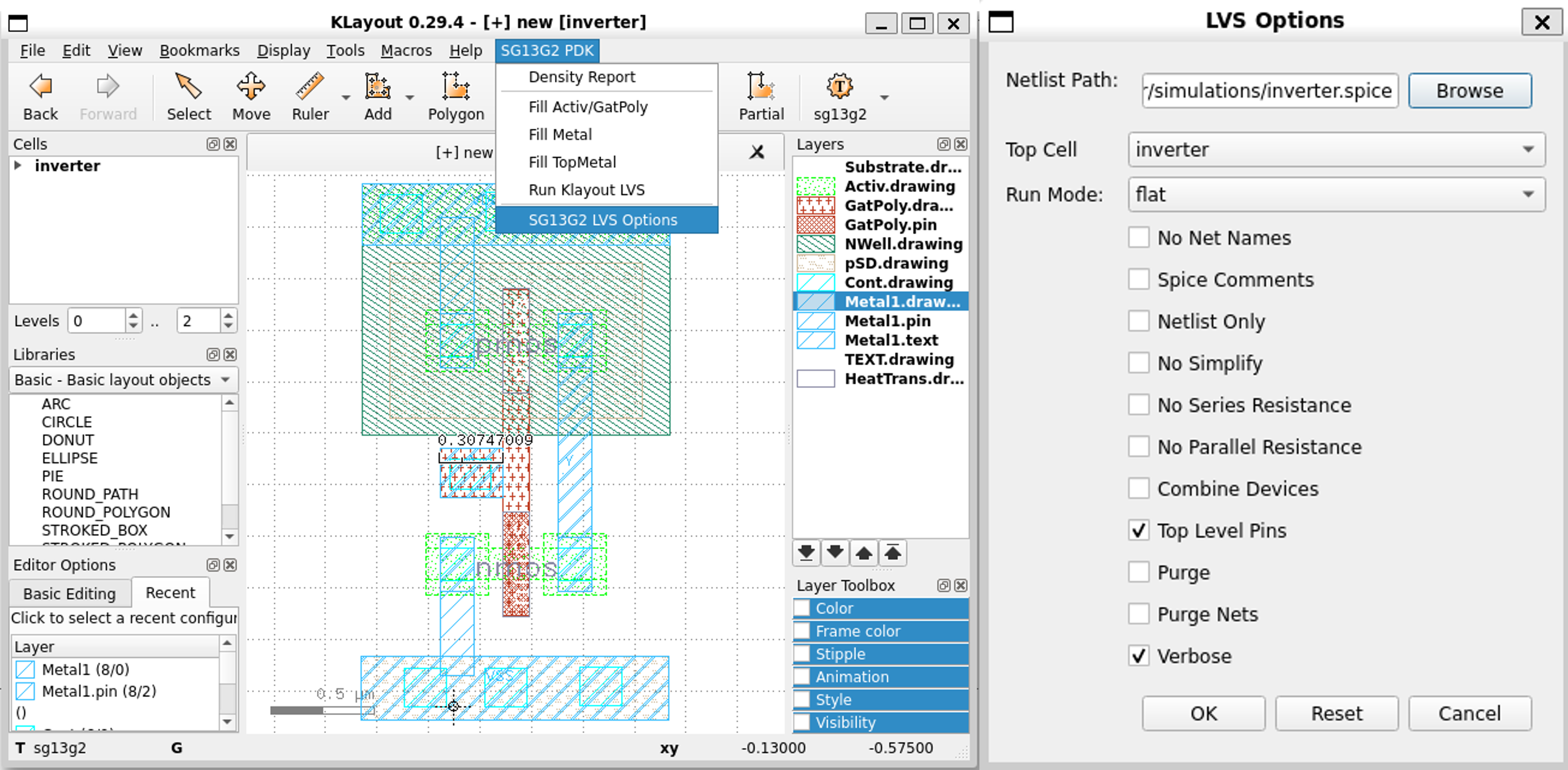 This section introduces how to layout the inverter in IHP SG130 PDK with KLayout including DRC and LVS.