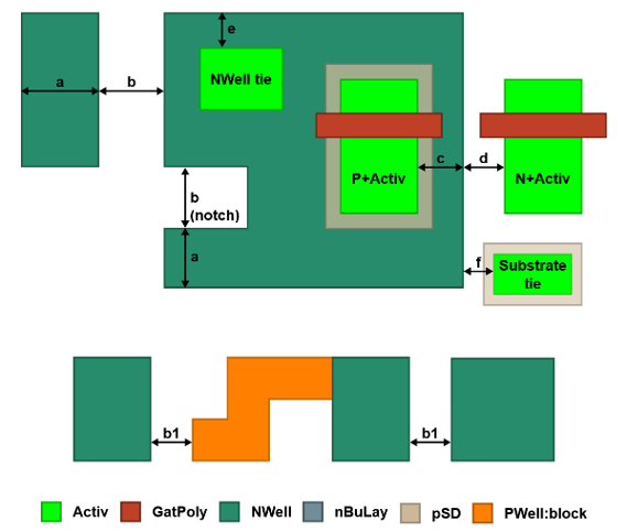 | NW.b | Minimum NWell space or notch (same net). NWell regions separated by less than this value will be merged. | 0.62 |