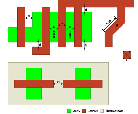 | Gat.g | Minimum GatPoly width for 45-degree bent shapes if the bend GatPoly length is > 0.39 µm | 0.16 |
