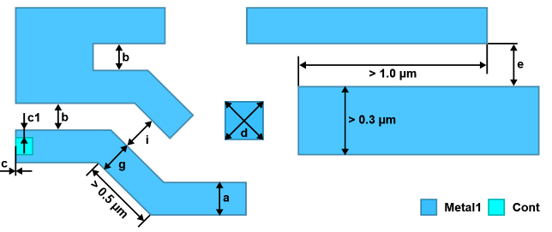 | M1.i | Minimum space of Metal1 lines of which at least one is bent by 45-degree | 0.22 µm |