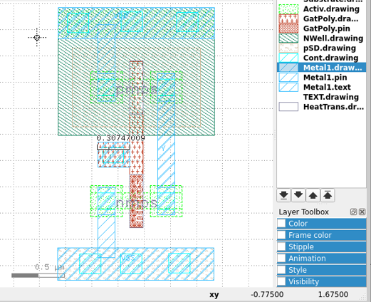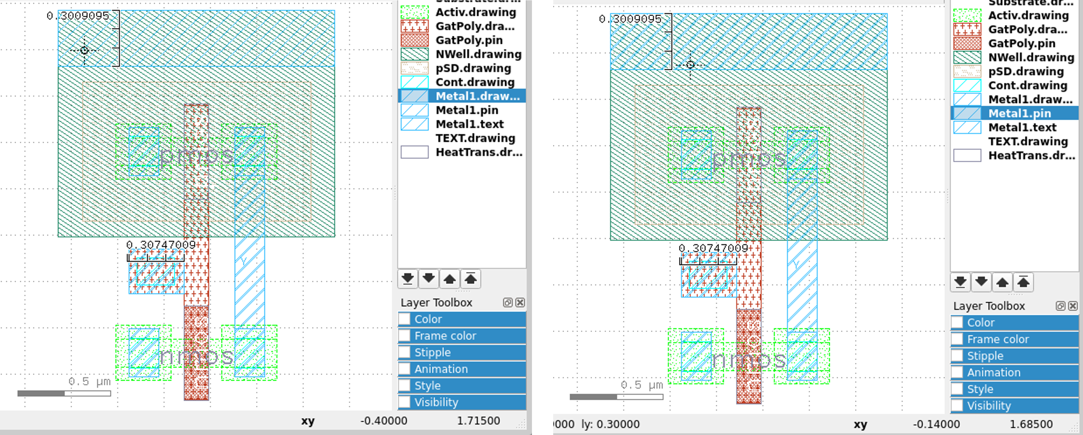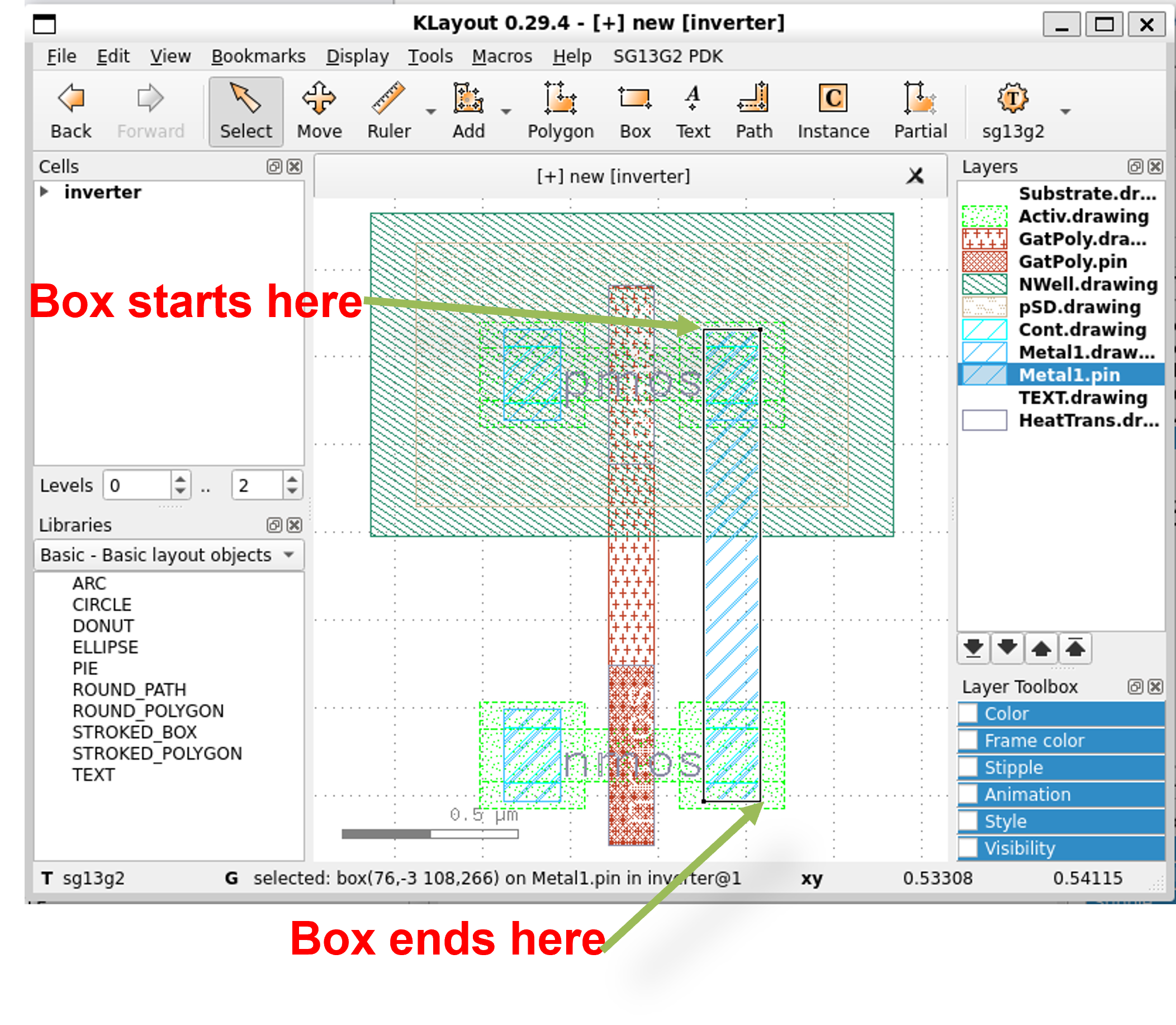 Metal1.pinin theLayerspanel and draw a box with the same size as the previous one -