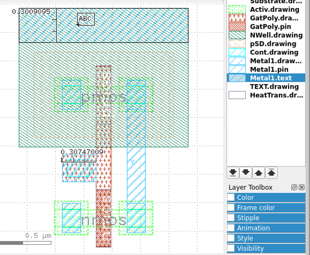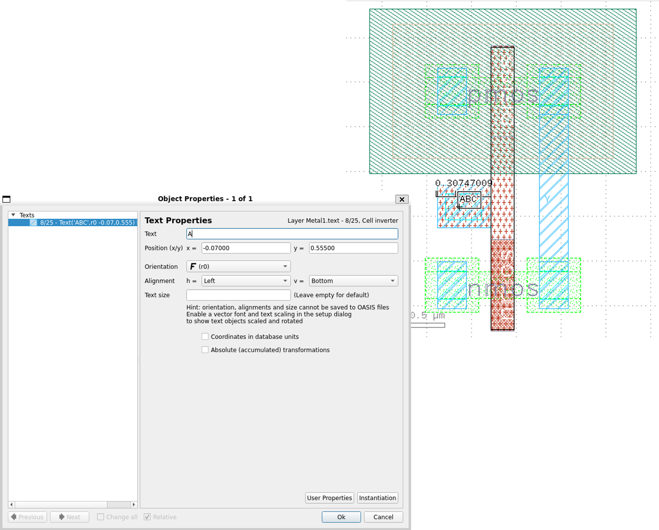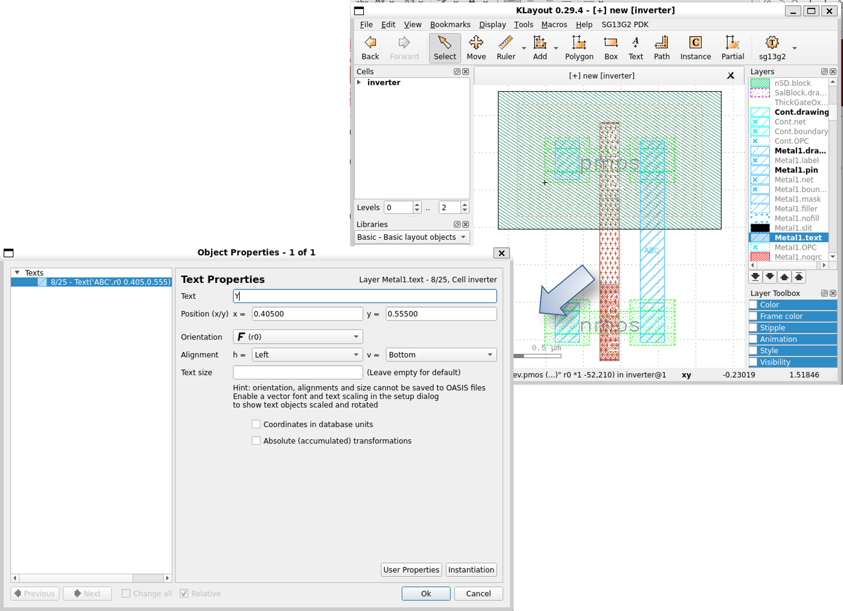 Metal1.textin theLayerspanel and clickTextbutton to place the text inside the pin