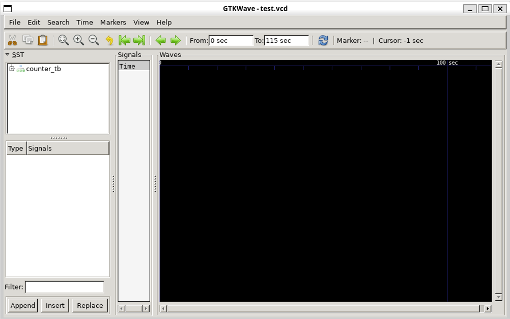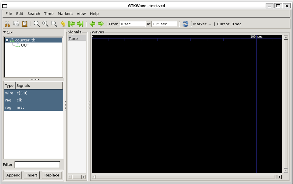 The simulation waveform was dumped into test.vcd file. This file can be viewed by using GTKwave. Open GTKWave to view the waveform by this command:
