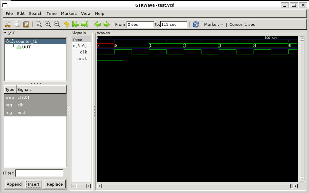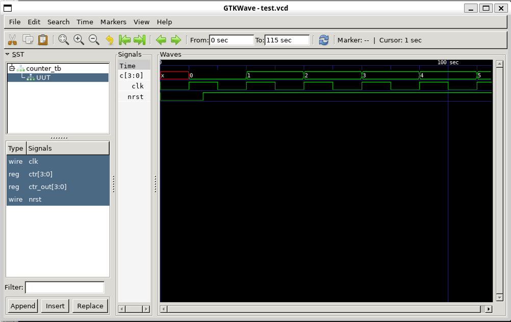 designer ~ $ iverilog -o counter_tb counter_tb.v counter.v designer ~ $ vvp counter_tb VCD info: dumpfile test.vcd opened for output. Counter value:xxxx @ time 10.000000 Counter value:0000 @ time 20.000000 Counter value:0000 @ time 30.000000 Counter value:0001 @ time 40.000000 Counter value:0001 @ time 50.000000 Counter value:0010 @ time 60.000000 Counter value:0010 @ time 70.000000 Counter value:0011 @ time 80.000000 Counter value:0011 @ time 90.000000 Counter value:0100 @ time 100.000000 Counter value:0100 @ time 110.000000 counter_tb.v:27: $finish called at 115 (1s) designer ~